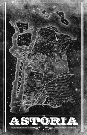 McDonald & Sons 1888 reproduction vintage map of Astoria, Queens. It shows the the southern part of Long Island City all the way through Astoria and up into the Steinway section in the north.
