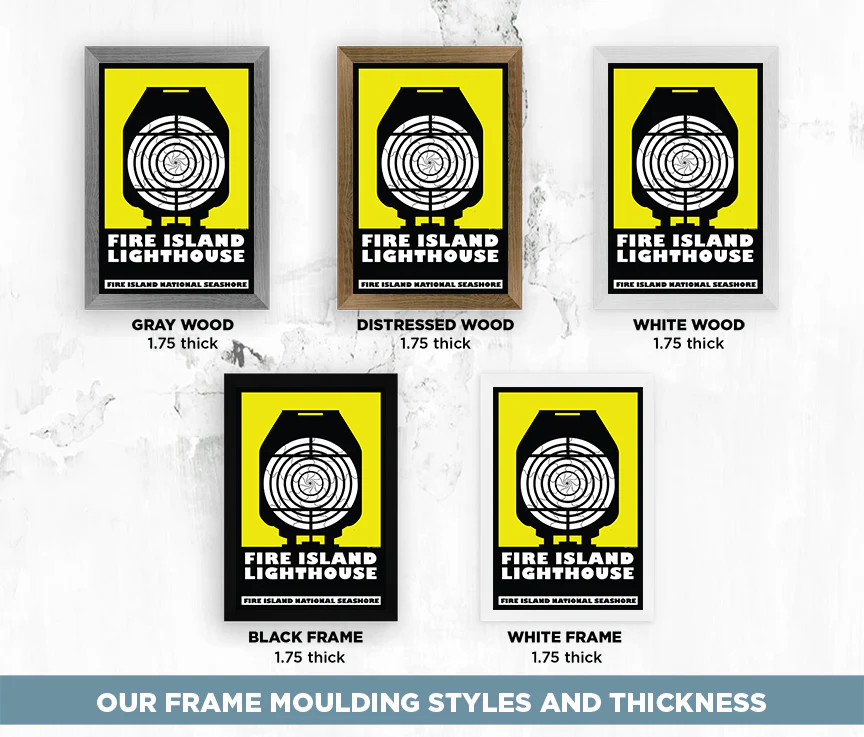 These commissioned pieces were originally made in part to honor the seashores 50th anniversary. Original digital illustrations made by the team at I Lost My Dog. Enjoy this bold graphic design of the fresnal lens of the lighthouse at Fire Island. All of our prints come framed or unframed and are sized to fit standard frames should you only purchase the print.