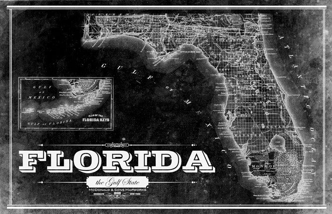 McDonald & Sons 1888 reproduction vintage map of Florida. It shows the the complete state, a closeup of the Keys and a sweet typographic treatment of the gulf state.
