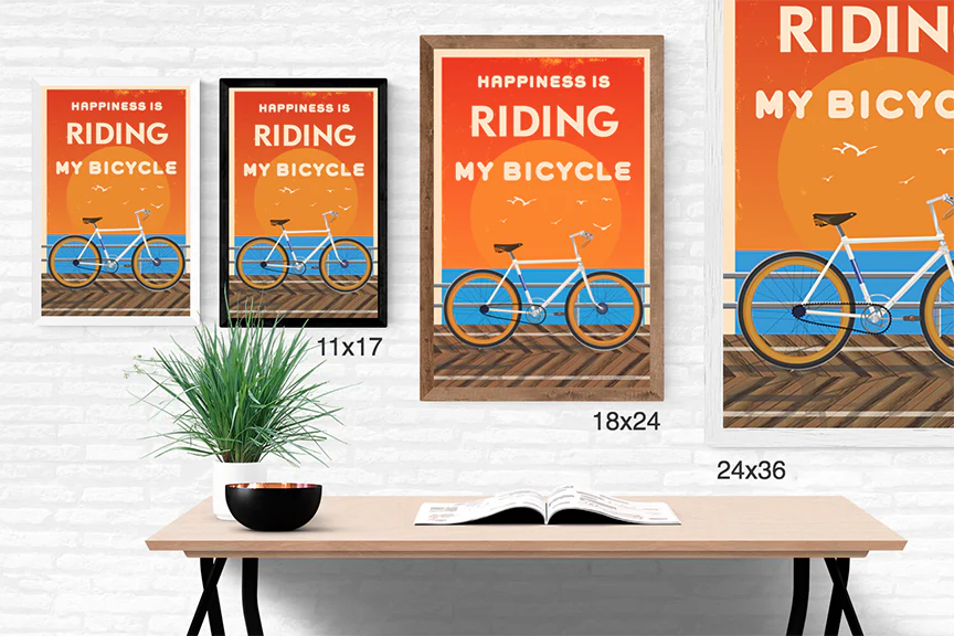 The joy of riding. This poster says it simply. Choose from two scenes: the sunset at your favorite bike riding boardwalk or the river-side trail with the mountain view.
