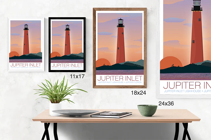 Original digital illustrations made by the team at I Lost My Dog. Jupiter Inlet Light Lighthouse located is located in Jupiter, Florida, on the north side of the Jupiter Inlet. Enjoy this bold graphic design as a high quality digital or giclee print. All of our prints come framed or unframed and are sized to fit standard frames should you only purchase the print.