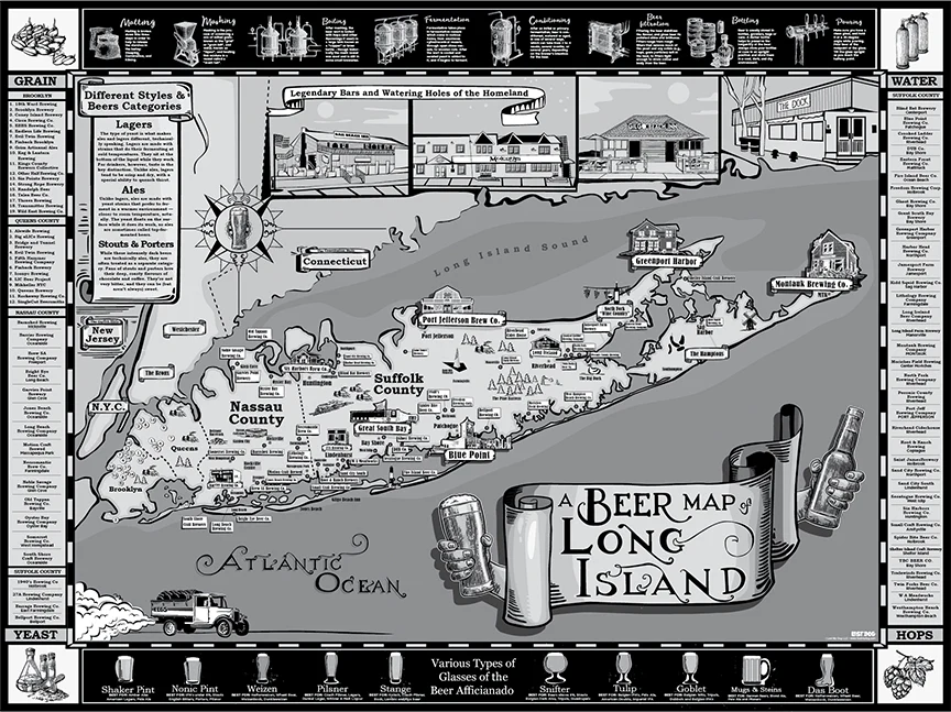 We got all of the breweries from Queens to Montauk listed and sure to impress and inform any lover of the world class breweries Long Island has to offer. Created in 2 formats to show off the island and also for beer lovers to learn more about the process of how beer is made and other cool beer facts.