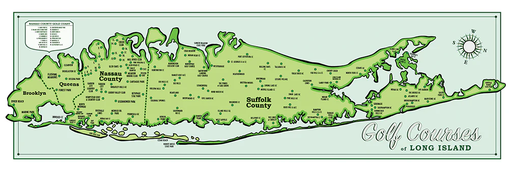 Arfully designed to show all of the golf courses of Long Island in a clean and beautiful poster.