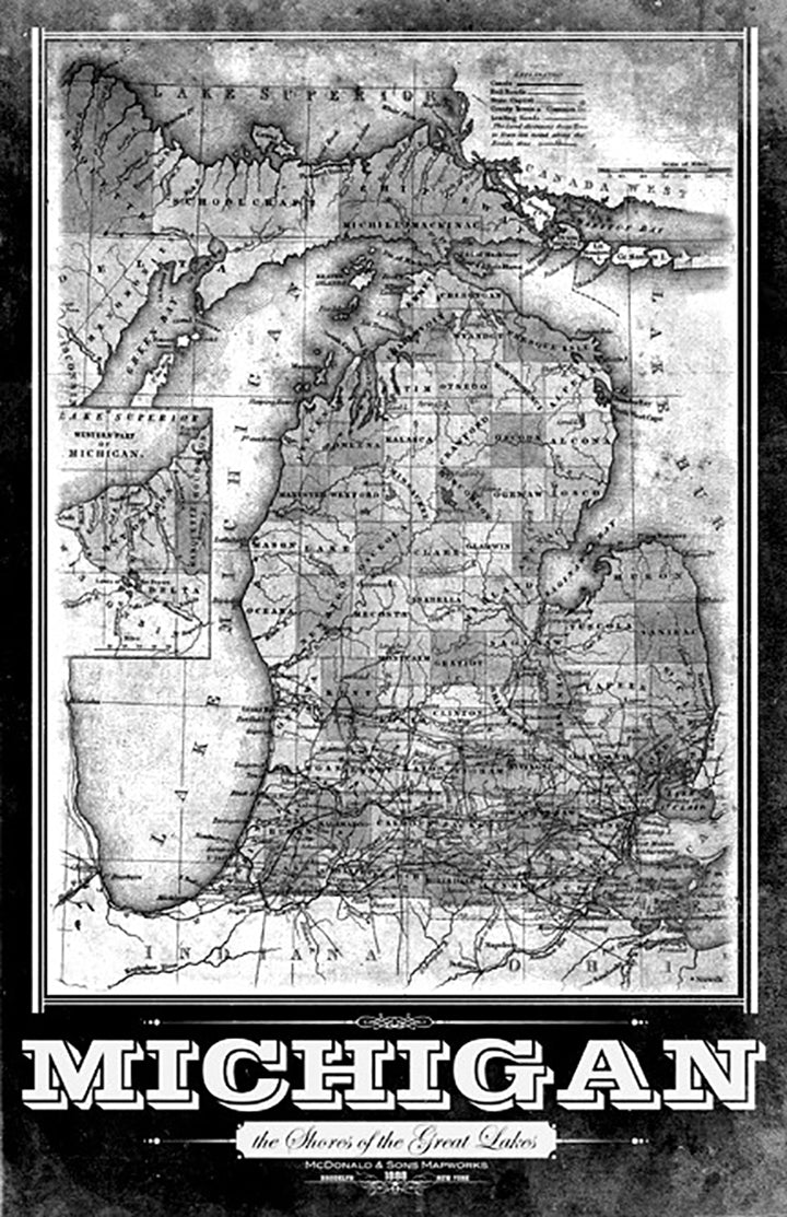 McDonald & Sons 1888 reproduction vintage map of Michigan. It shows the the complete lower part and upper P and a sweet typographic treatment of the state of great lakes.