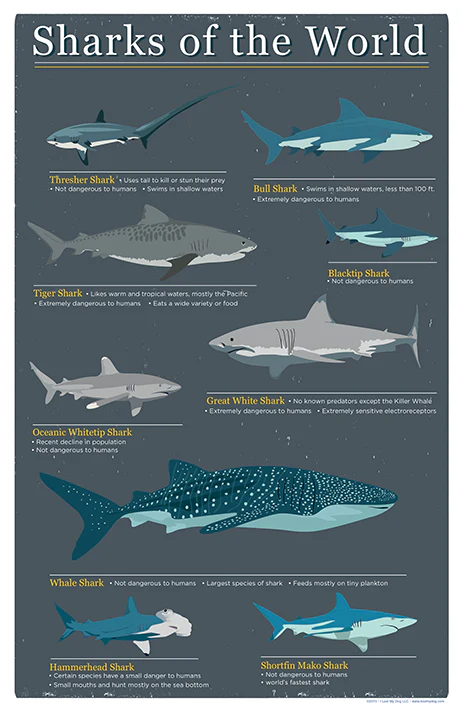 From blacktip sharks to whale sharks and everything in between, this clean, bold design lists some of the coolest sharks of the world. 11x17 Digital Print