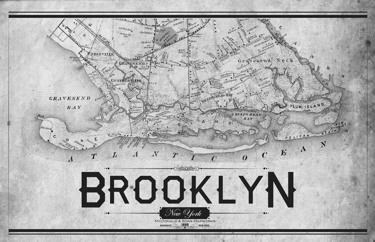 McDonald & Sons 1888 vintage remixed map of the southern part of Brooklyn. Included are the neighborhoods of Coney Island, Gravesend, Plum Island, Sheepshead Bay, Unionville, Guntherville and other places from the boroughs vast history.