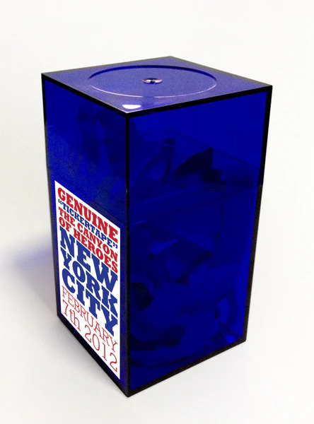 The Ticker tape: 100% Genuine ticker tape confetti picked up by me from the streets of Lower Manhattan after the parade down the Canyon of Heroes on February 7th. The case is a blue acrylic and measures 4.25 x 2.25 with a nice sticker that has the date of this historic event in New York history.